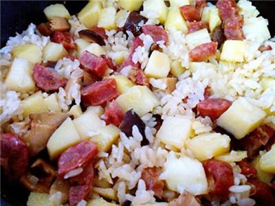 具体的做法:首先将米饭备好。再者将腊肠、洋葱切成丁状,而南瓜、土豆去皮、切丁即可。然后在锅里加入适量的调和油,油热之后,放入洋葱丁,炒出香味,再加入腊肠丁,煸炒腊肠、洋葱至金黄时盛出来备用,锅里在放入适量的油,放入土豆进行翻炒,等到土豆变色之后,再倒入南瓜进行拌炒,之后一道非常美味的土豆南瓜腊肠饭就已经做好了。